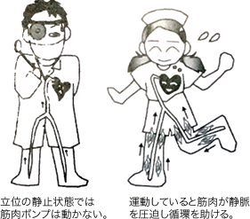 人間が二本の脚で立ち、歩き出した時から、下半身にたまった血液を心臓に戻すためには心臓のポンプの力だけでは不十分になりました。かわりに、脚の筋肉がポンプの役割をして血液を心臓に戻す役割を果たしているのです。そのため、脚は「第二の心臓」と言われています。